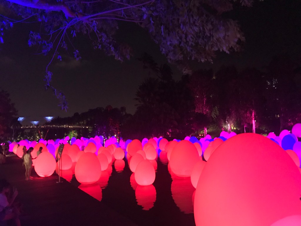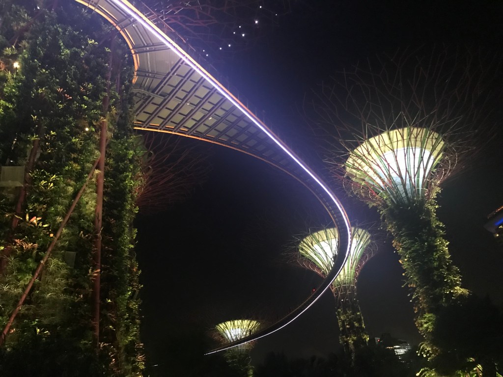 I suppose in hindsight, we should have thought about the crowds with it being New Year, but we didn’t think. We arrived at the ticket office, and were given a ticket to go up the Skyway at 9pm, which was the last admission time. There were so many people there, so we walked around the grounds, while we waited for our admission time. There are also two ‘Garden Rhapsody’ light shows per night (7.45 and 8.45). We picked our spot for the 8.45 show, and sat down to watch it. It was a spectacular show, with music and lights ‘dancing’ around the Supertrees which surround the main area and Skyway.